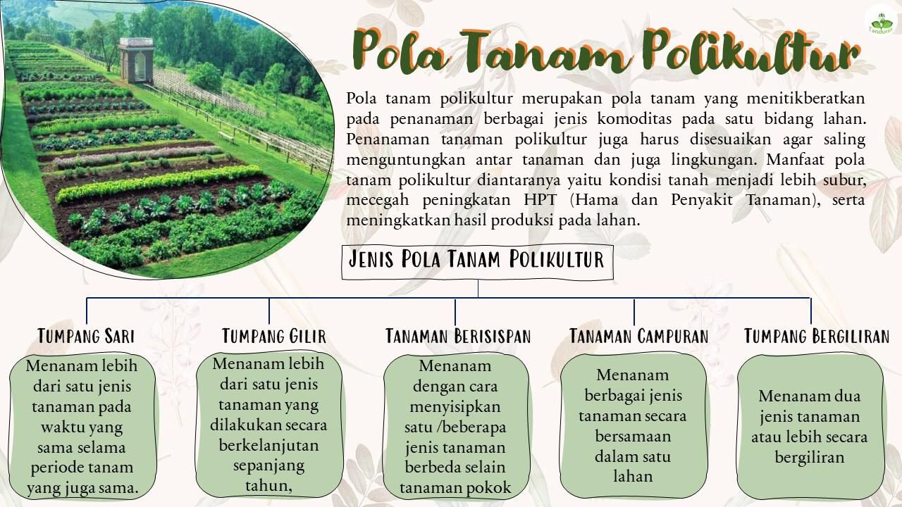 Pola tanam polikultur mengacu pada penanaman dua atau lebih jenis tanaman pada lahan yang sama secara bersamaan. Sedangkan agrobiodiversitas merupakan keragaman hayati dalam sistem pertanian, termasuk keanekaragaman tanaman, hewan, dan mikroorganisme. Penerapan kombinasi kedua metode ini bertujuan untuk menciptakan ekosistem pertanian yang lebih seimbang dan berkelanjutan.